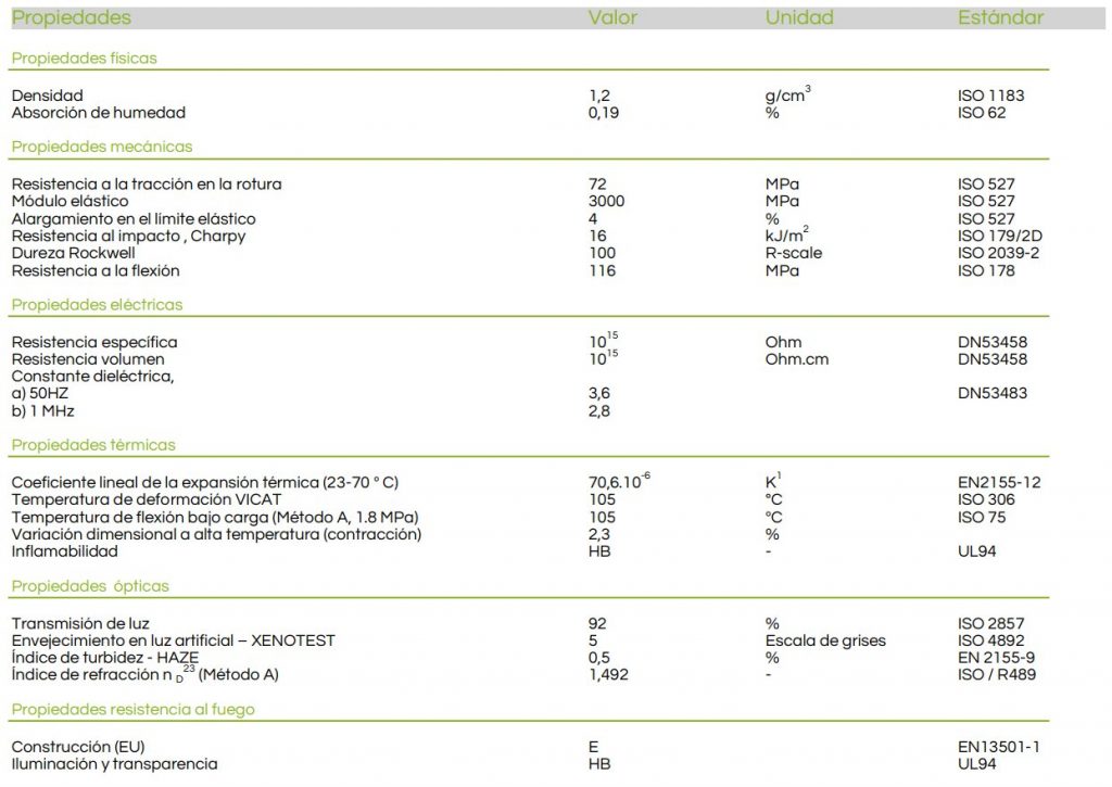 Hervorragende optische Qualität. Unbegrenzte Größe durch unsichtbare chemische Bindungen. Methacrylatplatten von 30 bis 200 mm hoher Härte. Geringe innere Spannungen. Hohe Beständigkeit gegen die Elemente. Schlagfestigkeit. Hohe Alterungsbeständigkeit. Hoher thermischer und akustischer Widerstand. Gibt beim Verbrennen keine giftigen Gase ab. Frei von Halogenen. Verfügbarkeit spezieller Großformate.